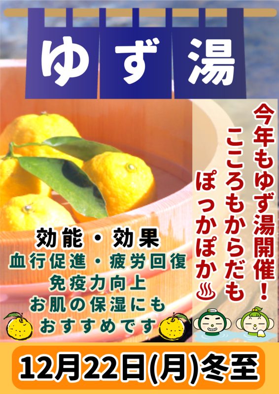 12月22日(月)の冬至は、ゆず湯を開催します。
